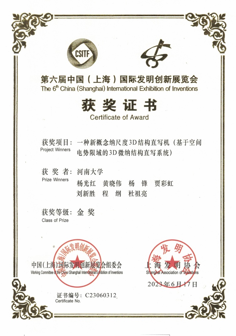 杨光红,男,高级实验师,从事微加工及仪器方面工作。主要成果:提出电子束的空间电势限域效应;基于该原理开发出3D微纳结构直写技术;设计了一种新概念纳尺度3D结构直写机(基于空间电势限域的3D微纳结构直写系统);主持省自然科学基金2项, SCI论文多篇,申报发明专利6项,包括授权中国发明3项(CN 111646428 B,CN 112599419 B,CN 113184801 B),美国发明1项(US17/597,858);已申报发明2项(CN 115101398 A,202310509312.4)。荣获2023年第六届中国(上海)国际发明创新展览会金奖。