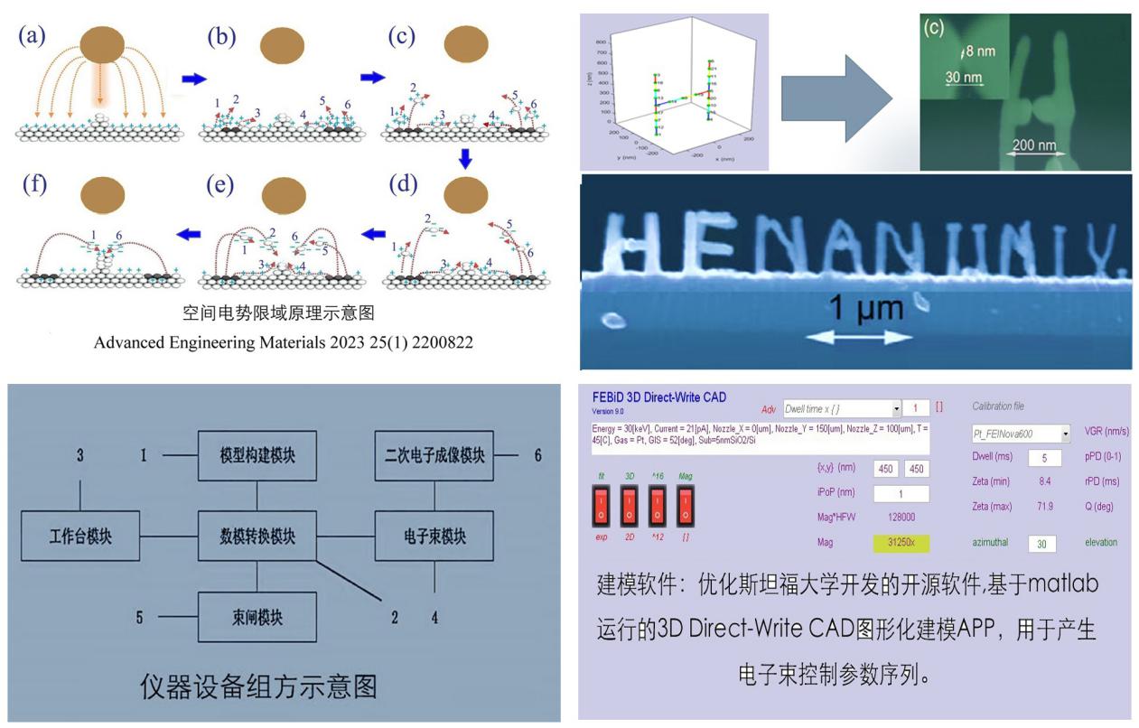 我们基于电子束的空间电势限域效应,精确控制材料原子的断键脱附、迁移和积聚过程,直写3D微纳结构。并利用建模软件与硬件结合,完成直写过程的数字化,实现基于空间电势限域的3D微纳结构直写系统。该设备弥补了目前创新型结构成型原理及相关设备的欠缺,解决了直写设备在精度控制、效率及节能环保等方面的缺陷与不足,可成功实现材料学领域纳尺度材料成型精确控制、金属/半导体3D微纳结构直写构筑。
