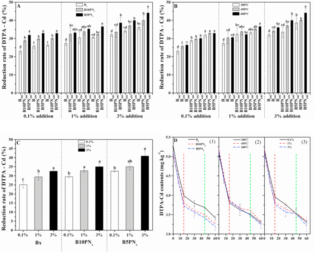 图2 在不同混合比例(A)、热解温度(B)、添加水平(C)和培养时间(D)下,生物炭材料对实验室土壤中DTPA-Cd的钝化效率