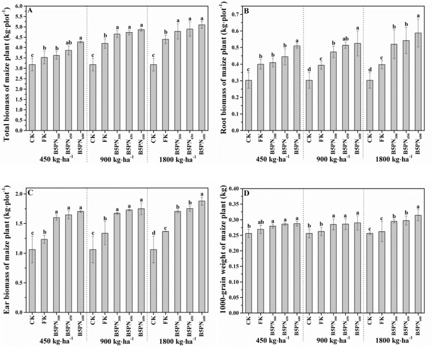 图3 不同处理下玉米植株总生物量(A)、玉米根系生物量(B)、穗部生物量(C)和1000粒重(D)