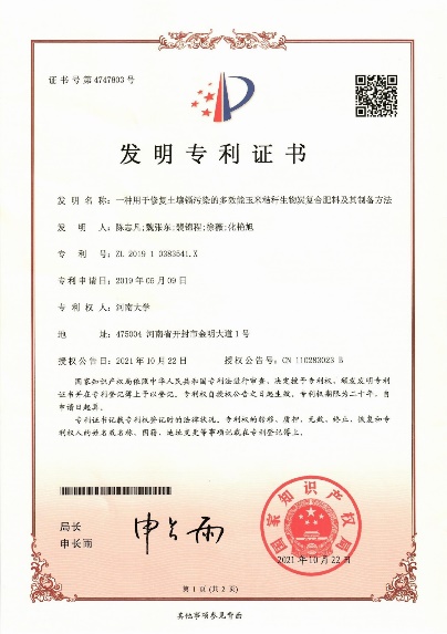 以玉米秸秆生物质、硅藻土、重过磷酸钙和尿素为原料,在不同热解温度(300℃、450℃、600℃)和混合比例(5:1:1:x和10:1:1:x)下合成了一种新型生物炭基复合肥(BCF)。开展了低施用量下BCF对土壤有效Cd的固定效率、以及对土壤肥力和玉米生长的影响研究。室内培养实验表明,低剂量的BCF(B5PNx和B10PNx)显著降低了土壤中Cd的有效性,有效态Cd的最高降低率高达44.13%。田间试验表明,低剂量(< 0.1%)的BCF(特别是B5PN600)能够改善土壤肥力并促进玉米生长(包括玉米产量)(图3),同时可显著降低玉米籽粒中的Cd含量。机理研究表明,提高热解温度可以提高生物炭对Cd2+的吸附能力;经尿素、硅藻土和重过磷酸钙改性后,随着官能团的增加、多孔结构的形成,以及表面共沉淀和络合作用,进一步提高了BCF对Cd2+的吸附能力;同时,增加了BCF的N、P、Si等营养物质含量,对土壤改良和玉米生长具有重要作用。本研究表明,在600℃下制备的生物炭基复合肥(BCF,混合比例为5:1:1:x)可以作为一种有前景的、环境友好的Cd污染土壤修复剂,并减少化学肥料的使用。该研究成果已在Environment Pollution上发表,并获批专利1项(专利证书附后)。目前,该专利已实施转化。