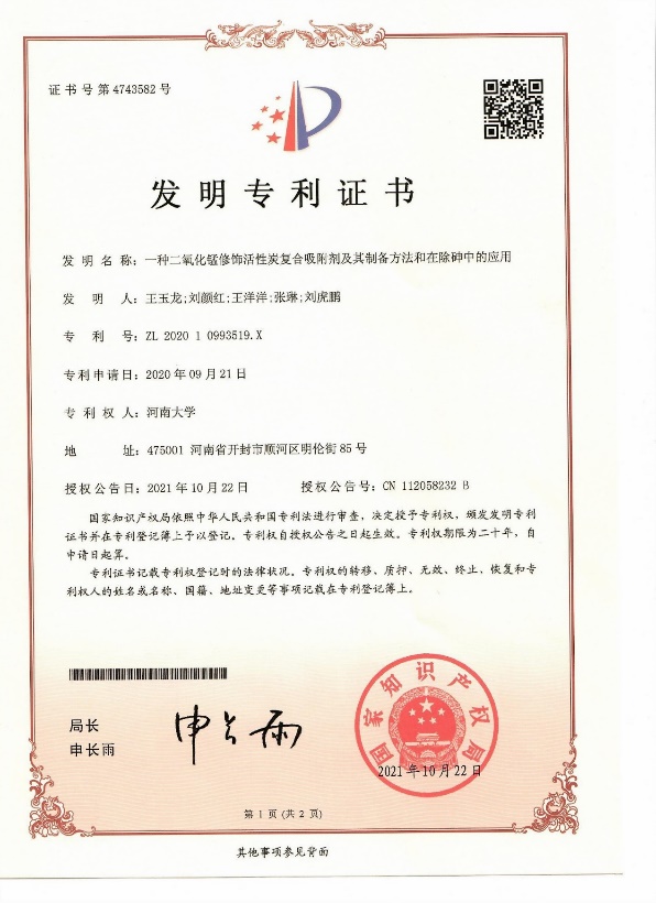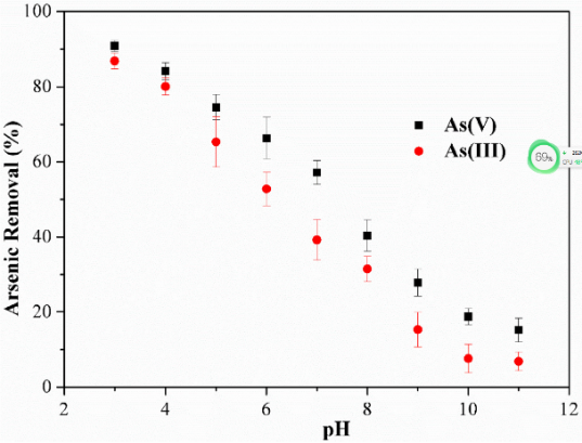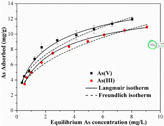 利用硝酸、高锰酸钾、氢氧化钾及乙醇制备δ-MnO2改性活性炭,并用于砷的同步氧化和去除研究。研究显示,改性过程降低了活性炭的比表面积,δ-MnO2的存在一定程度上堵塞了活性炭的空隙结构,其比较面积从28.5 m2/g降低至7.5 m2/g,平均孔径也从1.55 nm降低至0.976 nm。扫描电镜发现,改性前活性炭表面比较粗糙,存在一些明显的孔隙。而δ-MnO2改性后,活性炭表面出现了大量的聚集的块状δ-MnO2,活性炭表面变得相对平滑。在~37.6°与~66.3°较弱且宽两组特征吸收峰也证明了δ-MnO2成功负载到活性炭上。δ-MnO2负载的活性炭的零电点(pH)大约是1.40。As(V)和As(III)在δ-MnO2改性活性炭上的最大Langmuir吸附量是13.30和12.56 mg/g;As(V)和As(III)在δ-MnO2改性活性炭上吸附随着pH值的增大而减少(图6)。本研究表明,δ-MnO2改性活性炭在含砷废水或含砷地下水中砷的去除方面具有潜在的应用前景。该研究成果发表在J. Environ. Sci.上,并申请获批专利1项。