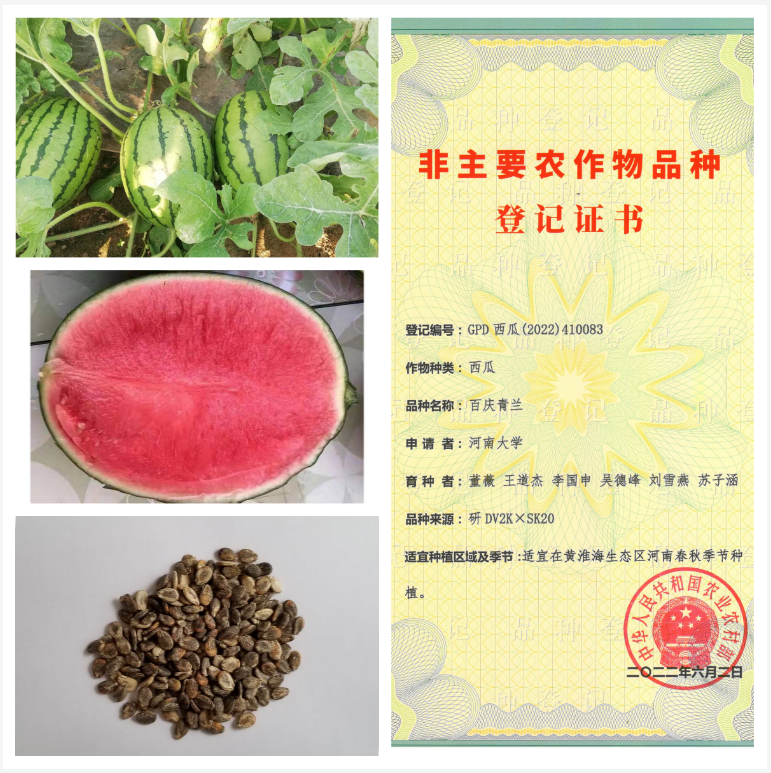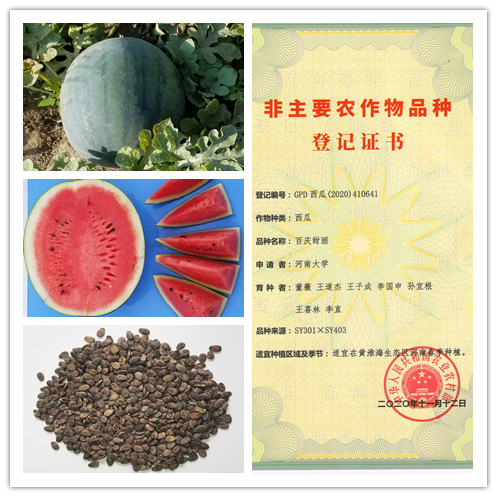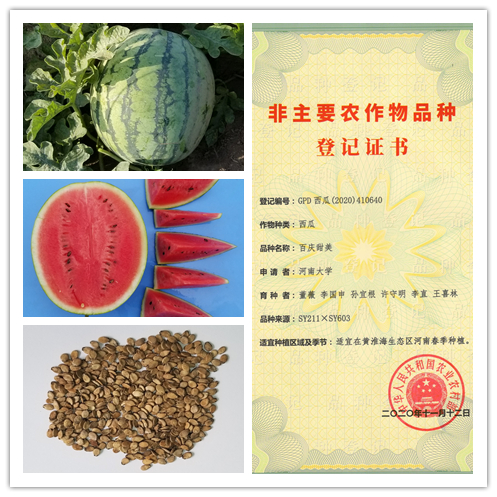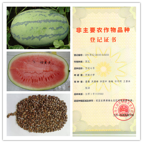 本项目组建立了西瓜种质资源库,收集了约1000余种不同类型的西瓜种质资源。为了加强特色育种材料的选育和创制,有针对性地进行杂交、回交配组结合分子技术,筛选了抗病优质的新品种。百庆甜丽属于早熟品种,可以促进西瓜提前上市,中心糖度超过12.5,新品种比现有区试对照品种增产8 %左右。百庆6号和百庆甜美西瓜属于中熟品种,中心糖度超过12.5,新品种比现有区试对照品种增产10 %左右,适合栽培区域广泛。百庆青兰和百庆煌玉属于早熟礼品型西瓜,中心糖度超过12.5,新品种比现有区试对照品种增产10 %左右。2019年总计推广约6000亩,实现增收约700万元。2020年总计推广约8000亩,实现增收约960万元。2021年总计推广约10000亩,实现增收约1200万元。产生了良好的经济效益和社会效益。