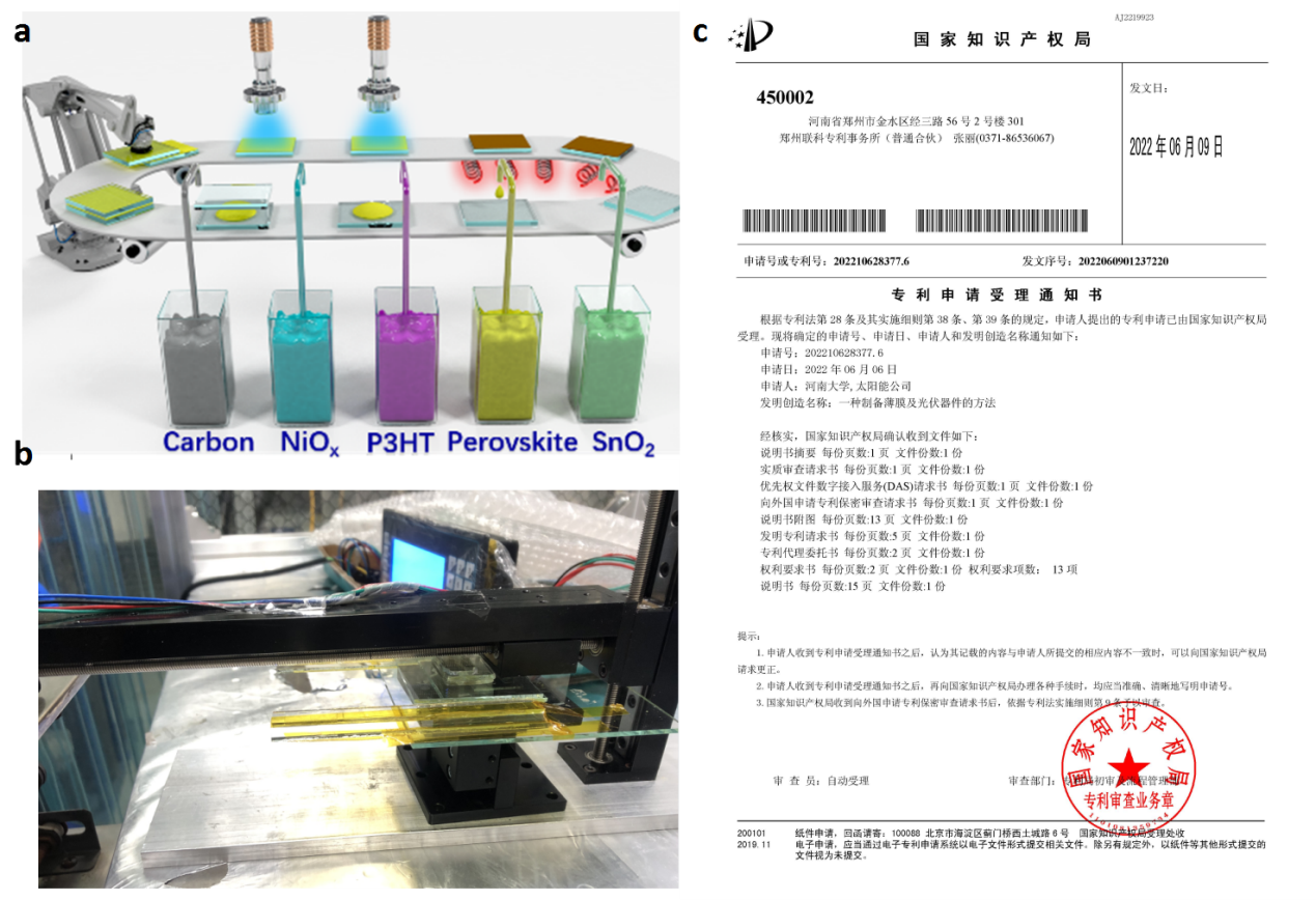 图1. a新型一体化成膜工艺过程,b原型机构造,c申请的专利