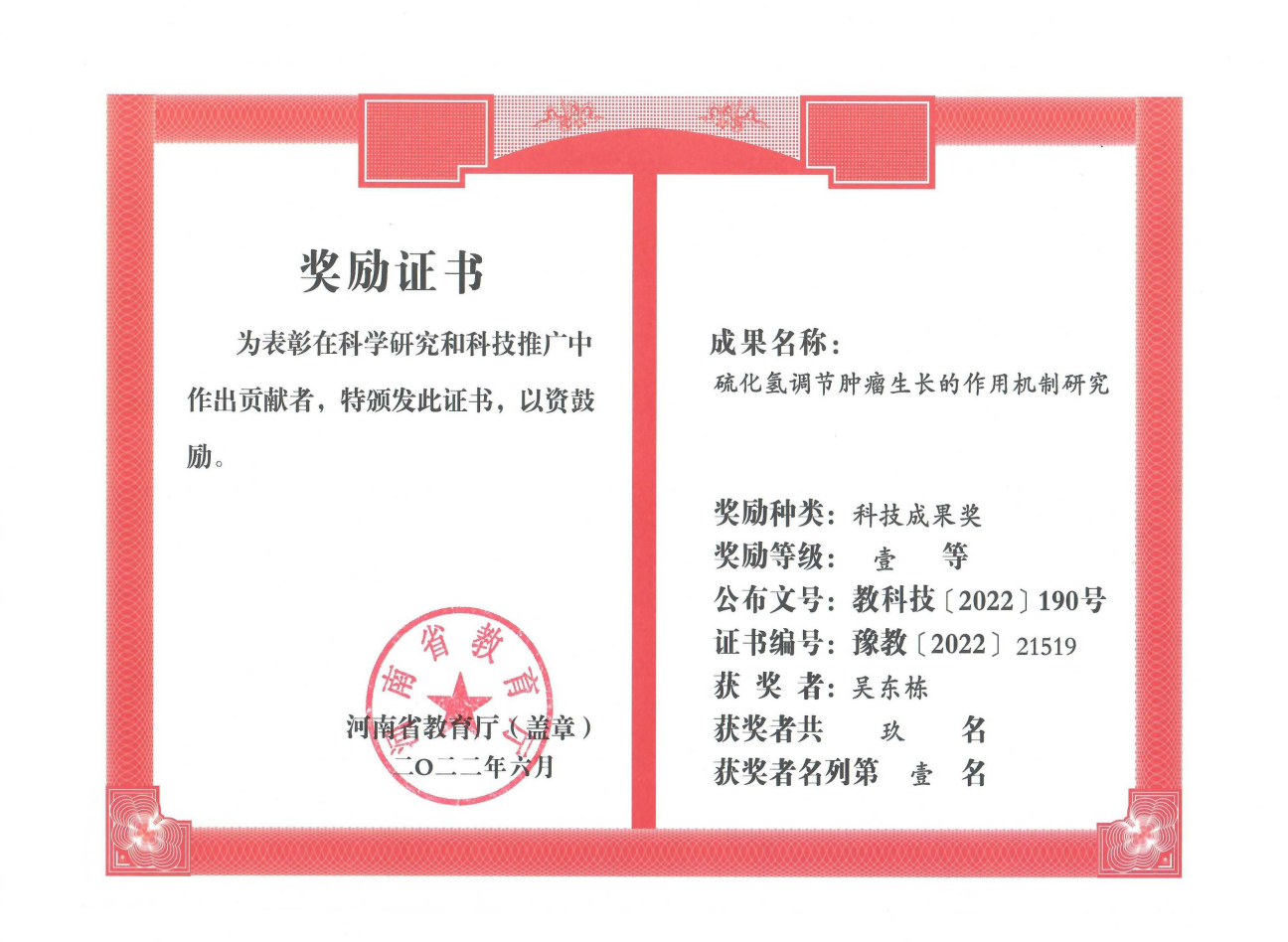 负责人以共同通讯作者在人鼻咽癌 (Oncogene 2022;41:5238-5252) 和食管癌 (Transl. Oncol. 2023;38:101770) 细胞中验证了内源性H2S促进肿瘤生长的作用,开发了一种新型H2S供体HA-ADT,其能够抑制人乳腺癌 (Cancer Lett. 2019;455:60-72) 和食管癌 (Exp. Cell Res. 2022;420:113341) 生长。《一种敲低CBS基因的方法及其在制备治疗人脑胶质瘤的药物中的应用》 (图1) 获得发明专利,研究成果 “硫化氢调节肿瘤生长的作用机制研究” 荣获河南省自然科学三等奖 (图2) 和河南省教育厅科技成果一等奖 (图3)。这些研究成果为开发H2S相关抗肿瘤药物奠定坚实基础。