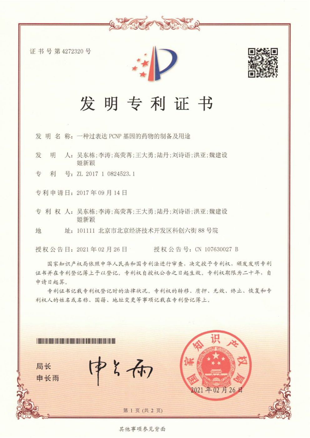 图5. 以第一发明人授权一种过表达 PCNP基因的药物发明专利