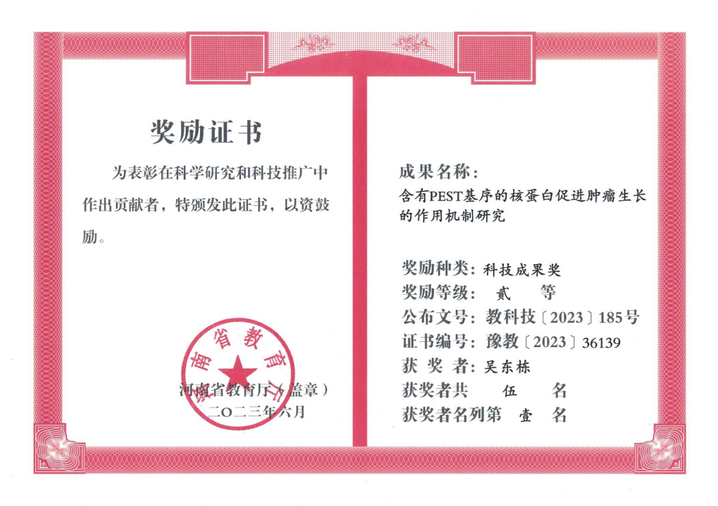 负责人以共同通讯作者在人肺腺癌 (Oncogenesis 2019;8:22) 和卵巢癌 (J. Cell. Mol. Med. 2020;24:8221-8235) 细胞中验证了PCNP促进肿瘤生长的作用,深入探讨了PCNP在肿瘤 (Front. Oncol. 2022;12:784597) 和基因治疗中 (J. Cell. Physiol. 2021;236(3): 1658-1676) 的作用机制。《一种过表达PCNP基因的方法及其在治疗人肝癌中的应用》(图4)、《一种过表达PCNP基因的药物的制备及用途》(图5) 获得发明专利。研究成果 “含有PEST基序的核蛋白促进肿瘤生长的作用机制研究” 荣获河南省教育厅科技成果二等奖 (图6)。这些研究成果为开发PCNP相关抗肿瘤药物奠定坚实基础。