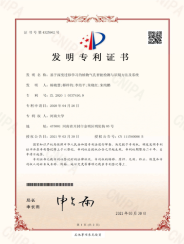 【创新成果1】智慧农业方面,团队成员与双一流生物学科密切合作,通过图像识别、大数据分析和人工智能技术设计的全自动高通量农作物表型智能分析模型和算法获得了国家发明专利,荣获中国(上海)国际发明创新展览会金奖,开发的系统国内外研究工作者可公开使用。另外,围绕我省在农业数据采集、农作物智能识别、作物产量预测等方面的需求,立足河南大学双一流学科建设,研究农业数据的智能解译方法。正在构建农作物无人机遥感检测与数据库,并开发了基于无人机智能识别的农田灾害监测系统。