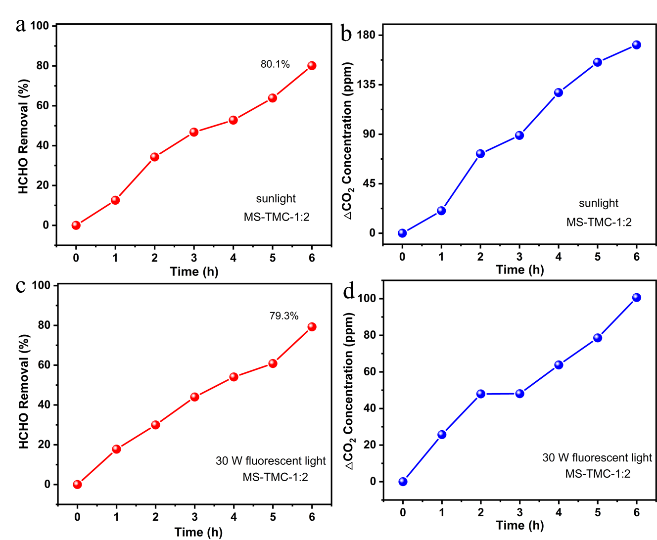 (c, d)复合催化剂在模拟室内灯光下降解HCHO的性能评价。