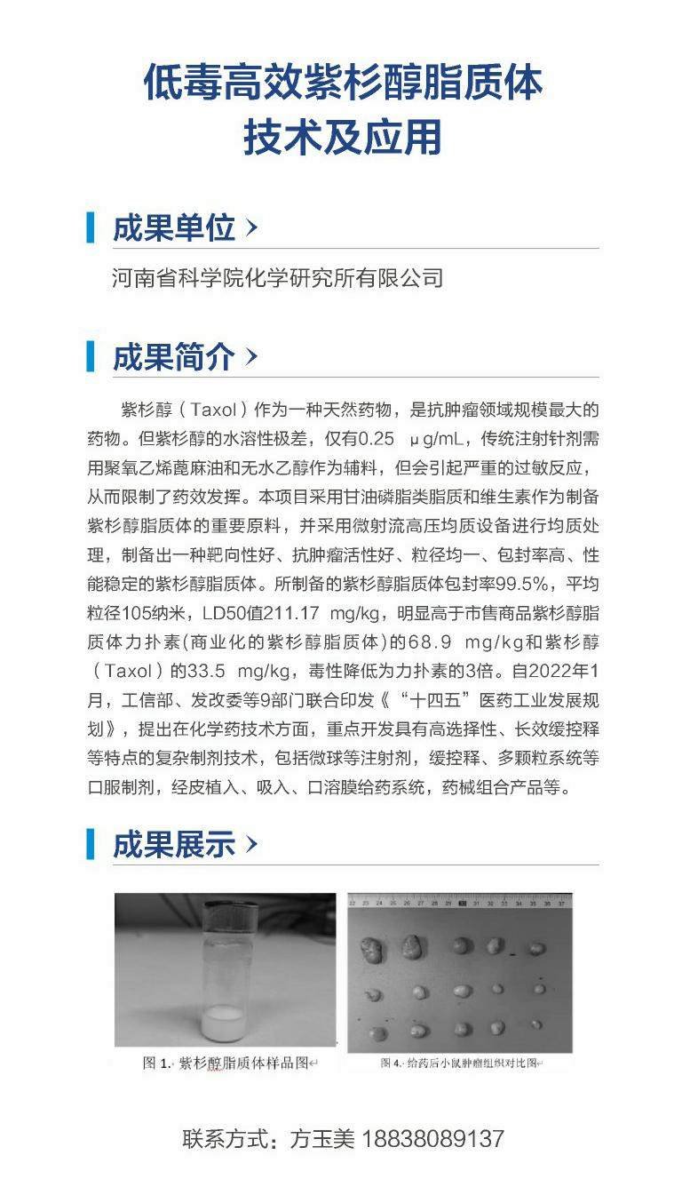 低毒高效紫杉醇脂质体技术及应用(河南省科学院化学研究所有限公司)